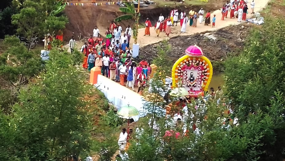 A few days before I was due to leave the ashram, I saw an announcement that there was an opportunity to visit Sadhguru Shri Brahma’s ashram in Yedapalli. I went along, not knowing what to expect. After a beautiful drive through misty tea plantations, we arrived at a small village, and disembarked. Across a small stream, we could see – and hear – the celebrations.