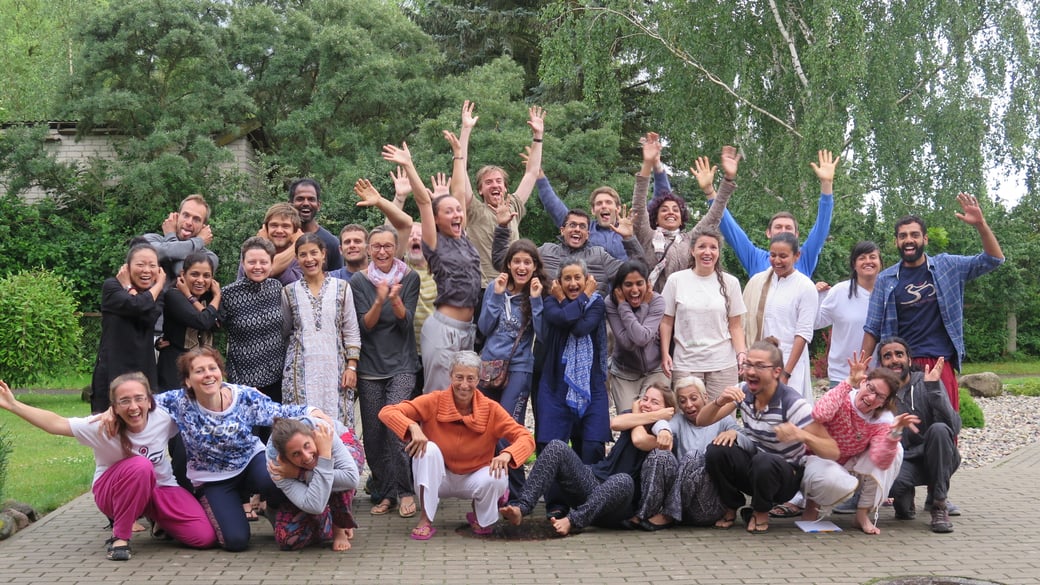 [Obviously, this photo wasn't taken during the time of social distancing! It's to illustrate the joy and playfulness of the Isha Hatha Yoga Teachers in Europe. This was taken in Lithuania, at our 2017 upgrade.]